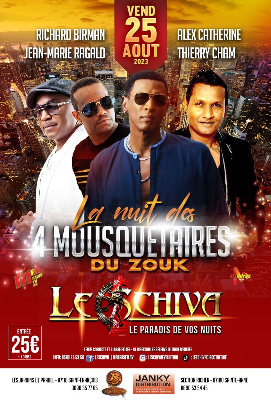 La nuit des 4 Mousquetaires du Zouk, avec Le boss du zouk Richard Birman, le chrooner Jean - Marie Ragald, Thierry Cham, et le prince du zouk Alex Catherine