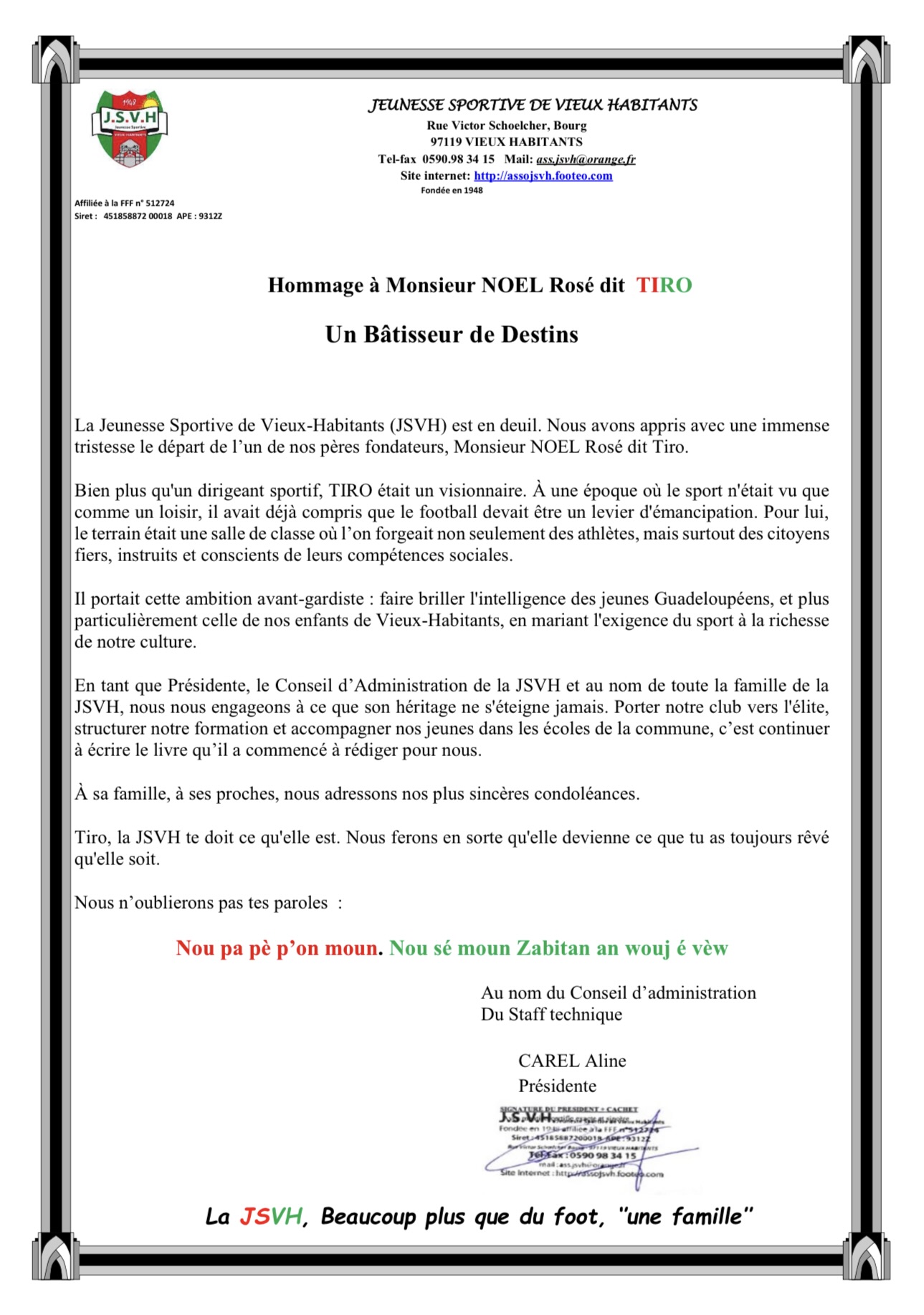 La Jeunesse Sportive de Vieux - Habitants (JSVH) est en deuil. Nous avons appris avec une immense tristesse le départ de l'un de nos pères fondateurs, monsieur NOEL Rosé, dit Tiro.